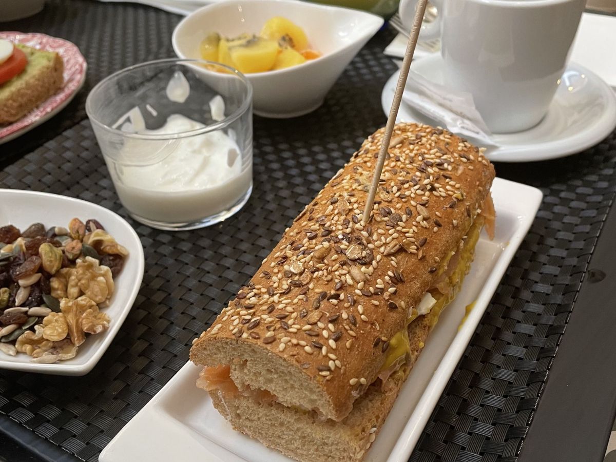 Suplemento de 3 €: Zumo de naranja recién exprimido, aguacate, salmón ahumado, quesos de Can Xicoy, jamón ibérico, productos para vegetarianos.